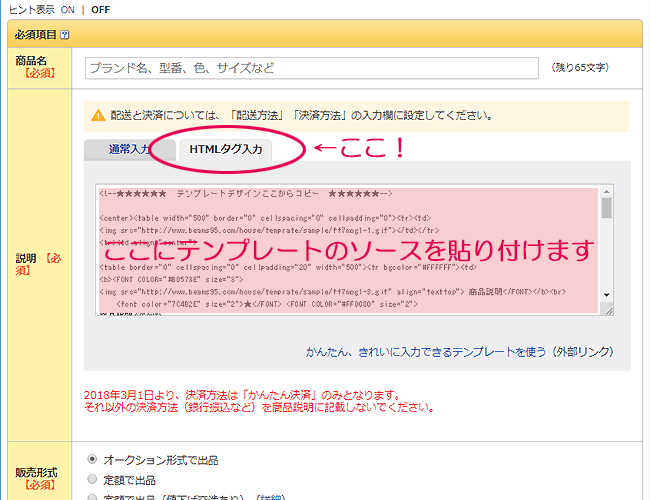 上記のようにメモ帳やテキストエディタから、「商品説明」「コメント」「支払い方法」「配送方法」などご自身の商品情報に書き換えます。